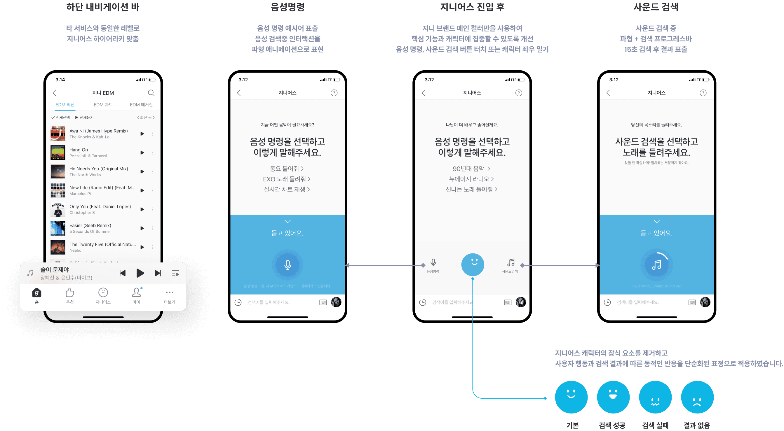 지니의 전체 아이콘 디자인을 리뉴얼하였습니다.지니 브랜드 아이덴티티 (친한 친구 + 중성적 이미지 + 소년의 이미지)를 표현하되아이콘의 곡선, 복잡도에 따른 규칙을 정의하고 일반적으로 사용하는 메타포를 최대한 활용하여 인지의 혼란이 적도록 개선하였습니다. 낭비되는 이미지 리소스의 레거시를 제거하였고 앱이 느리다는 사용자들의 피드백을 줄였습니다.